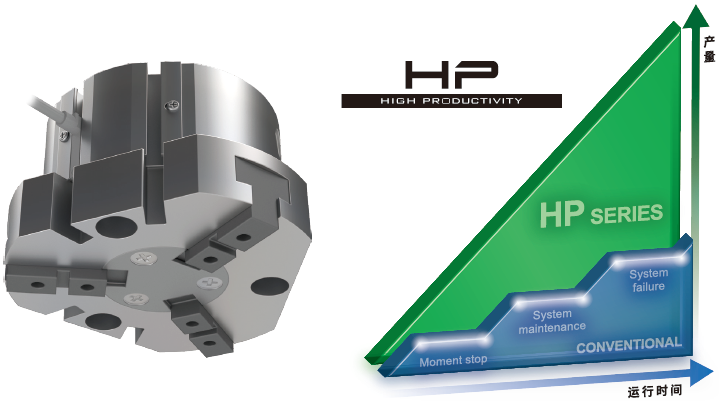 薄型、轻量紧凑型的3爪卡盘已发展成为HP系列。在保持高夹持力和重复精度±0.01mm的同时,为移载工序的长期稳定运转做出贡献。